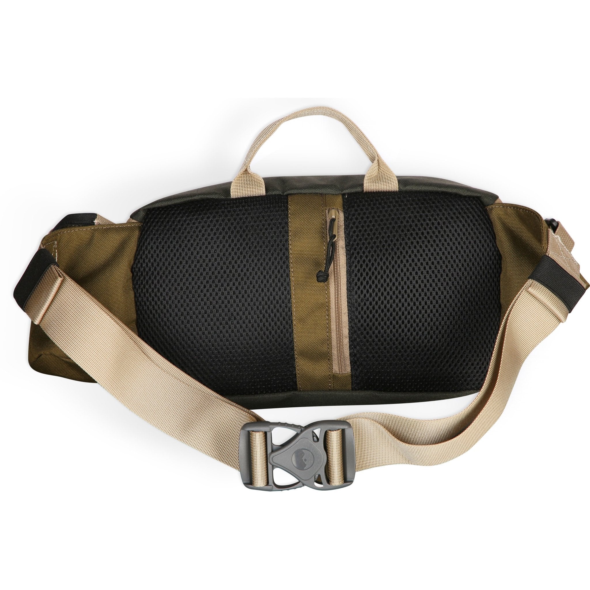 Belt bag / sling pack with adjustable straps and side release buckle, fixed hand strap, exterior rigging and cinch straps, zip pocket and canned beverage holder that can detach and be reattached on either side, main compartment with two way zip closure, one interior zip and two mesh pockets, rope loop zip pulls, padded back mesh panel with security zip pocket.