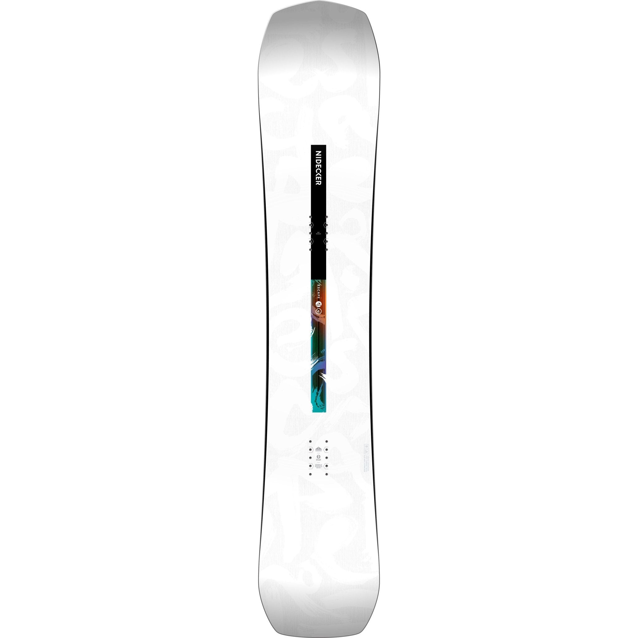 Performance is further elevated with carbon fiber stringers placed between the inserts and nose/tail, which enhance ollie power, dampen vibrations and provide extra control at higher speeds. Built with a premium sandwich construction that includes Triax-Plus fiberglass and Nidecker’s lightweight yet durable Master Core (a mix of poplar and paulownia), the Escape delivers consistent flex, responsiveness and durability. An Absorbnid topsheet helps reduce chatter for a smoother ride, while the N-7000 base offers faster glide than standard extruded bases with less maintenance required.