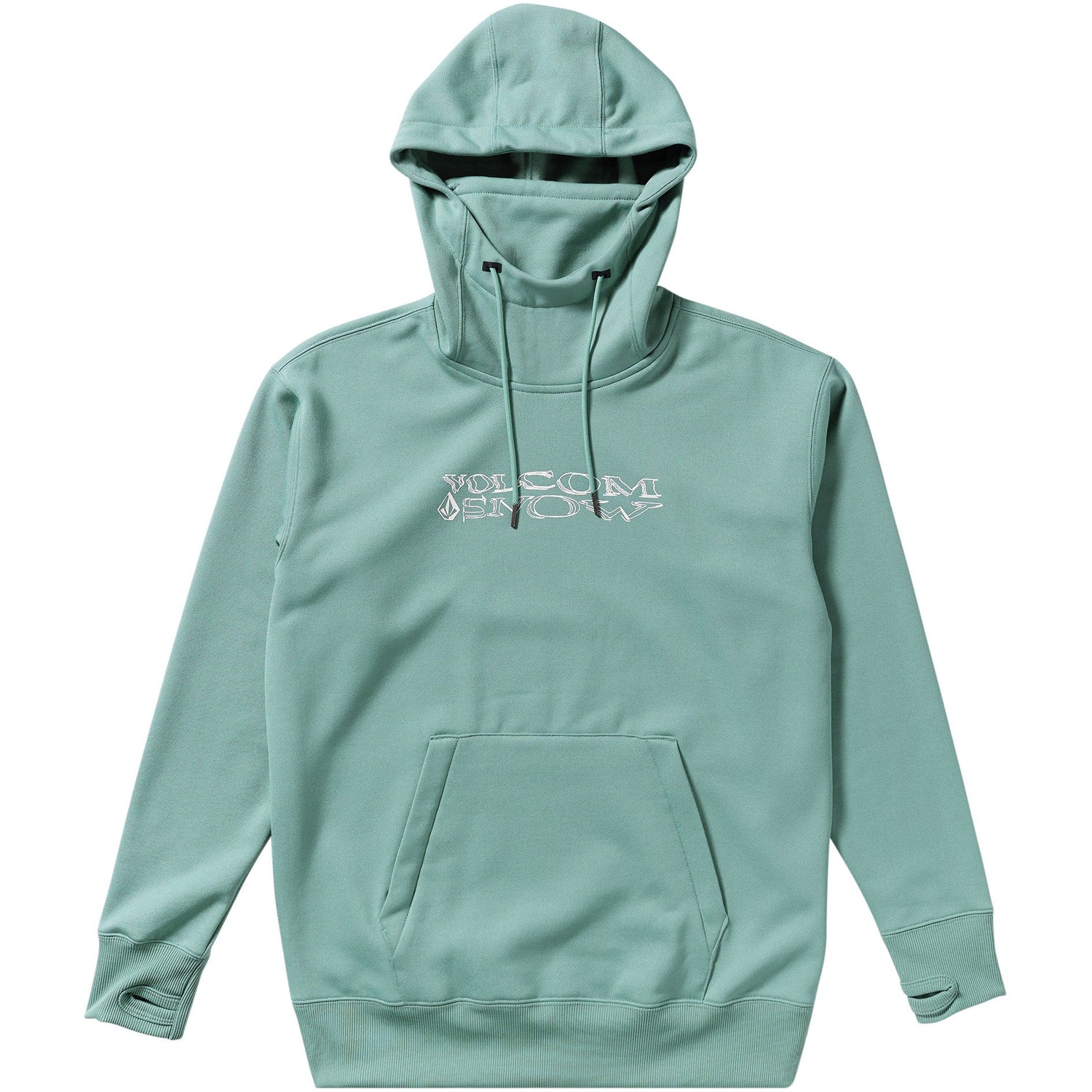 A riding hood with bungee cinch provides adjustable coverage, while thumbholes, ribbed cuffs and a ribbed hem help seal in warmth. The zippered handwarmer pocket keeps essentials secure and hands toasty and the clean warp snow screenprint at the chest adds a hit of style that stands out on the slopes or in the streets.